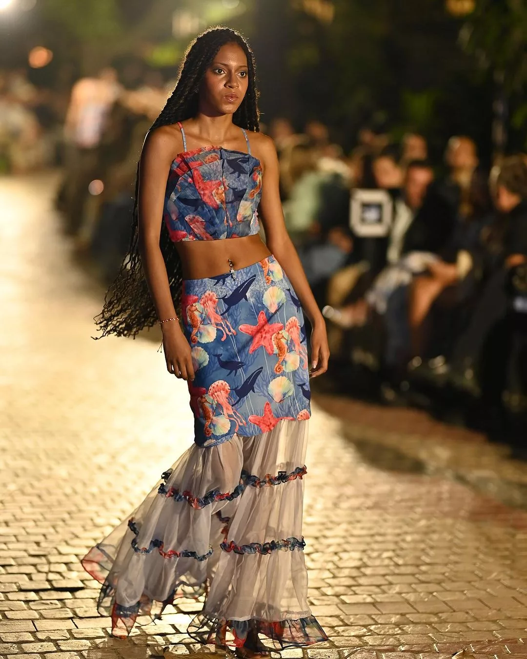 Ziruma abrió el show con dos túnicas azul brillante que fueron acompañadas de unos bolsos entretejidos con alegres colores amarillos y rosados inspirados en la cultura Wayuu. Luego la pasarela se tiñó de suaves tonos blancos, rosados y crema para el resto de las prendas: crop tops con diferentes cuellos, estampados de flores, shorts y pantalones para hombres y mujeres.