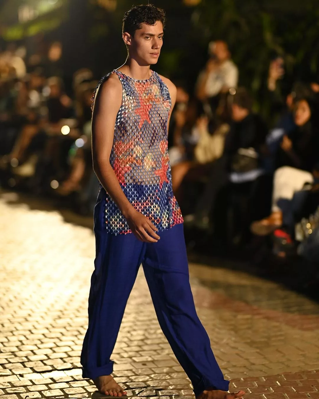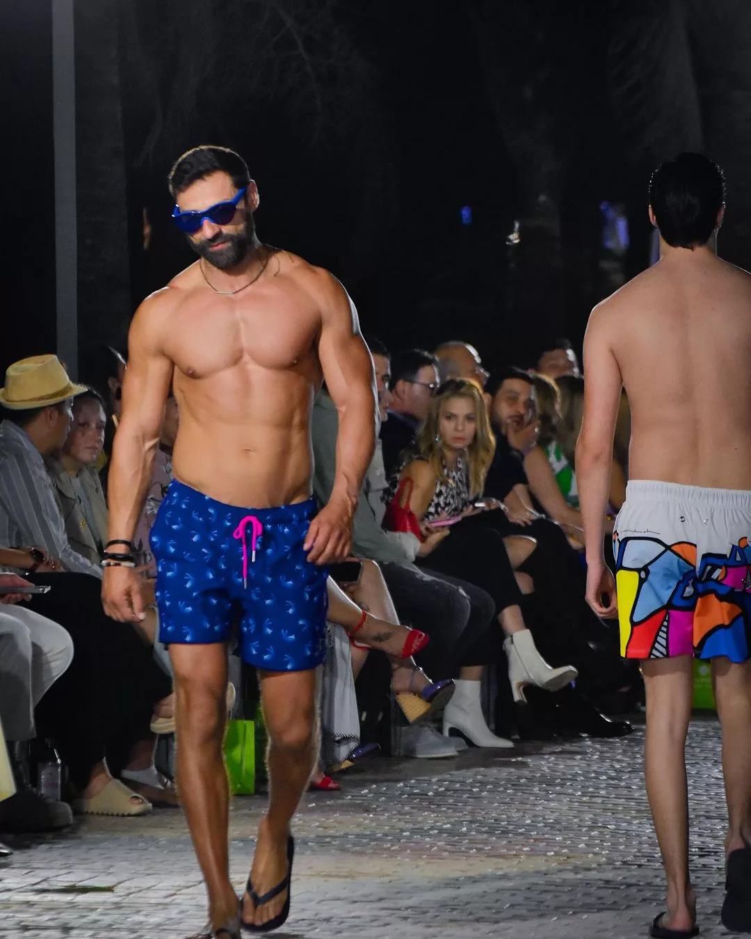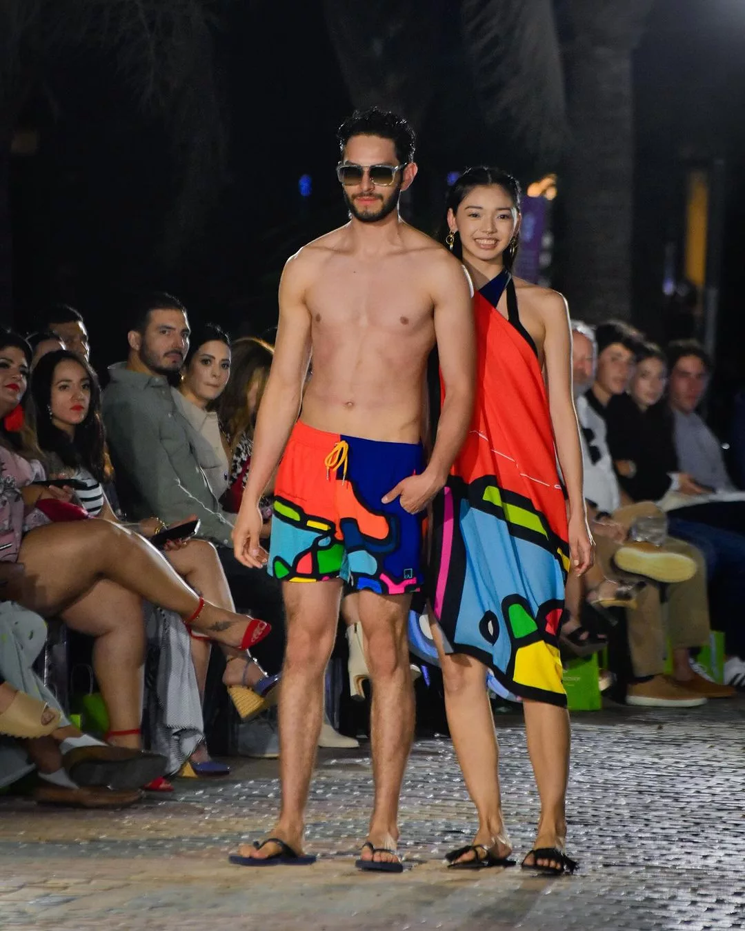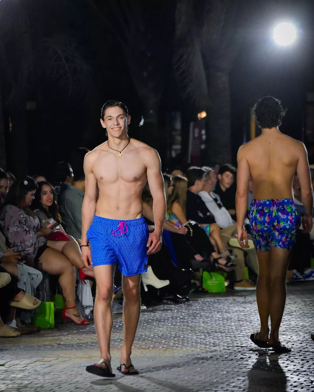 La colección que pisó la pasarela fue Retrospectiva Tropical. Calzonetas cargadas al azul y con toques de colores rosados, naranjos y celestes en estampados geométricos y florales como en acuarela. Esta vez, la diseñadora aventuró en pareos para mujer a juego con las calzonetas.