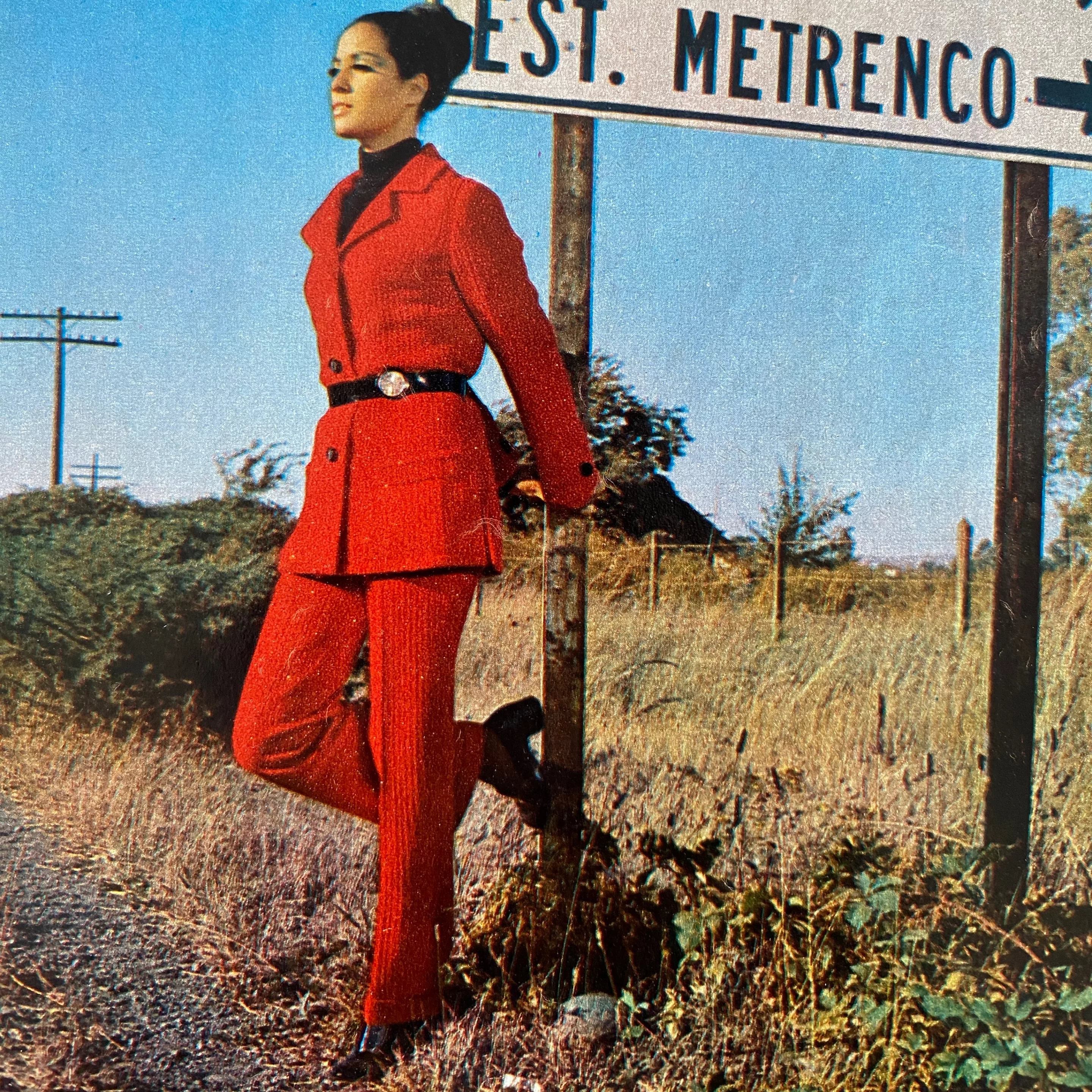 FOTO 2: Terno rojo de jersey. Diseño De Laura Rivas, Colección Otoño-Invierno 1969. Fotografías: Waldo Yáñez y Ugo Russo. Fuente: Eva Nº 1247, marzo de 1969.